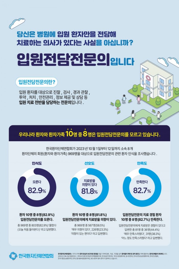 환자단체연합회, 회원(환자·가족) 969명 대상 입원전담전문의 환자 인식 조사 결과 발표