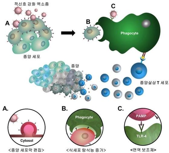 엑소좀을 이용해 암세포 표면에 '표적신호'를 전달하고(A), 표적이 이식된 암세포가 면역세포를 활성화해(B-C), 암을 효과적으로 제거할 수 있다. [KIST 제공]연구팀에 따르면 이번 치료법은 일부 암에만 적용되는 것이 아니라 유방암, 대장암, 림프종 등 다양한 암에서 뛰어난 항암면역을 일으켜 암을 제거하는 것으로 확인됐다.