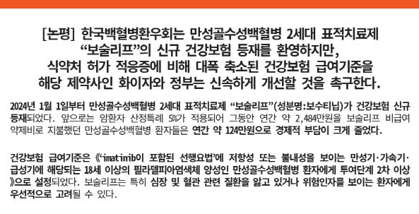[논평] 만성골수성백혈병 2세대 표적치료제 "보술리프" 건강보험 급여기준 확대 촉구