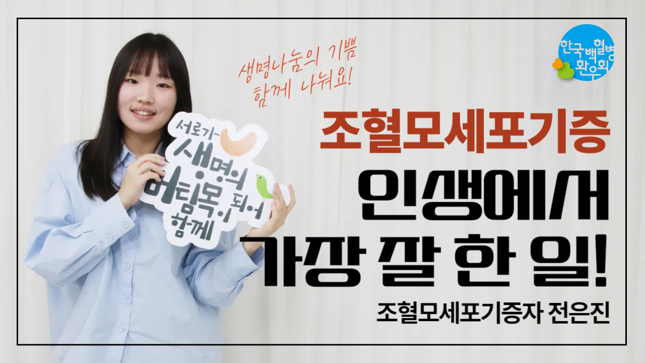 백혈병이나 혈액암과 같은 조혈모세포에 이상이 생겨 발생하는 난치성 혈액종양환자에게 생명을 나누는 일, 조혈모세포기증입니다. 오늘 백혈병혈액암환우회TV에서는 백혈병환우회의 반딧불이 서포터즈이자 2022년 조혈모세포를 기증한 전은진양의 이야기를 담아봤습니다.#백혈병 #혈액암 #조혈모세포 #기증 #생명 #나눔