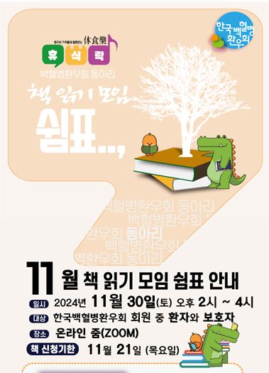 한해의 끝과 시작이 함께하는 계절에 위로하고 위로 받을 수 있는 시간, <휴식락_2024 겨울밤, 행복이야기>에 초대합니다.일시 : 2024년 12월 1일 (일) 오후 5시~8시장소 : 포레스트 구구 (서울시 종로구 윤보선길 65, 2층 / 지하철 3호선 안국역 1번 출구 도보 약 3분)대상 : 환자와 환자가족 (한국백혈병환우회 회원)