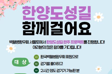 백혈병환우회 서둘토에서 한양도성길을 함께 걷고 있습니다.따뜻한 봄날, 한양도성길의 멋진 경치와 좋은사람들, 그리고 건강이 있는 서둘토에 참여하세요!▶ 일시 : 4월 12일 / 4월 26일 오전 10시 (2회)▶ 걷기 코스 및 집결지 :* 4월 12일 : 남산(목멱산) 구간 (집결지 동대입구역 6번 출구)* 4월 26일 : 인왕산 구간 및 백악산 구간 일부 (집결지 시청역 2번출구 대한문 앞)▶ 준비물 : 운동화, 생수, 간식, 걷기 편안한 복장, 바람막이 점퍼 등