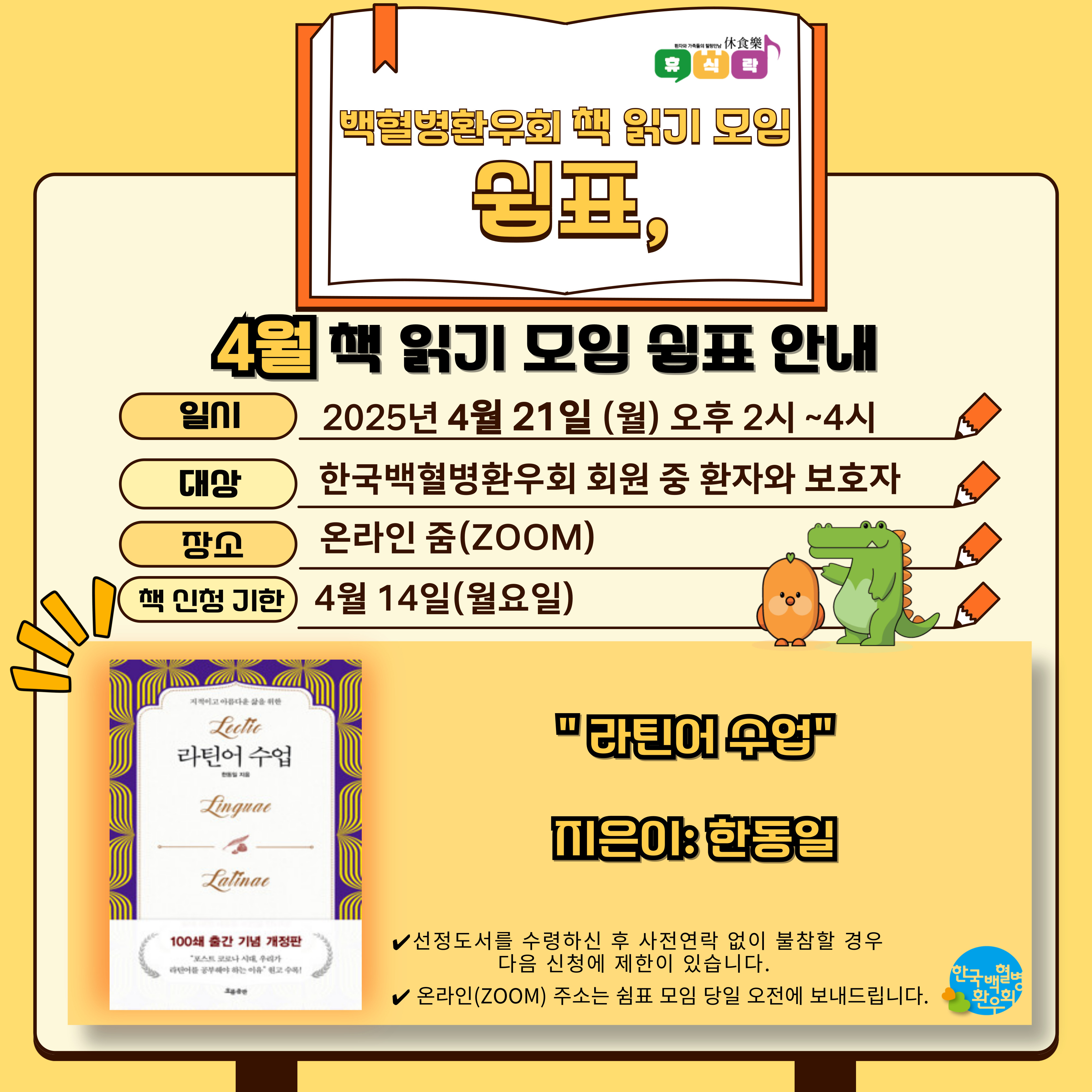 4월 책읽기 모임 쉼표는 '라틴어 수업'과 함께 합니다.✔ 일시 : 2025년 4월 21일(월) 오후 2시~4시✔ 장소 : 온라인 ZOOM✔ 책 신청기한 : 2025년 4월 14일(월)쉼표 참여 이벤트도 진행하고 있으니 많은 관심과 참여 부탁드립니다