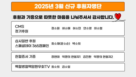매월 1회 보내드리는 본 뉴스레터는 백혈병혈액암환우회TV를 통해 발행된 영상과 한달간의 백혈병환우회 소식을 담고 있습니다.백혈병환우회는 환자와 환자가족, 후원자, 봉사자가 함께 하며 오로지 회원과 시민들의 자발적 소액 기부로 운영되고 있는 비영리민간단체입니다. 백혈병환우회의 활동에 많은 관심과 응원 부탁드립니다.
