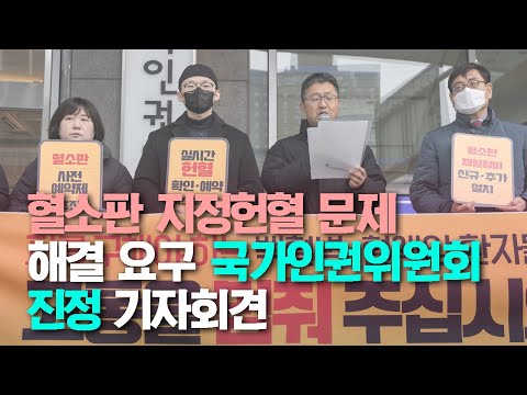 한국백혈병환우회는 지난 15일 국가인권위원회 앞에서 "혈소판을 환자나 환자가족이 직접 구하는 지정헌혈 문제 해결 요구" 기자회견을 개최 한 후 국가인권위원회에 지정헌혈 문제 해결을 권고해 달라는 진정을 했습니다.보건복지부 장관, 대한적십자사총재, 대한산업보건협회 회장을 피진정인으로백혈병, 혈액암 환자의 치료에 필수적인 성분채혈혈소판을 안정적으로 공급해야 할 의무가 있음에도 제대로 그 의무를 이행하지 않아 인권침해와 차별행위를 했다는 것이 진정 이유입니다.